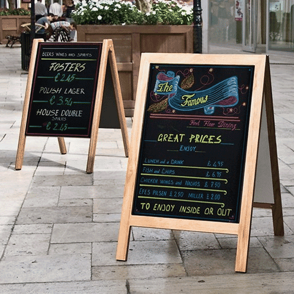 A-Skilt i lys bøg inkl. magnet kridttavle 46x68cm. Klassisk træskilt 54 x 95 cm i massivt lyst bøgetræ med sort magnet- og kridttavle 46 – 68 cm er et gadeskilt i en klasse for sig selv. Du er selv herre over budskabet, som kan ændres med kort varsel, idet du selv skriver på skiltet med hvide eller farvede kridtmarker penne. Samtidig kan du bruge vores magnet plastfronter til dine printede menuer, idet selve tavlefladen er en sort lakeret magnet ståloverflade. Skriv, tør af og brug dine A4 print sammen med vore A4 plastomslag med sort magnetbånd. PET ruderne kan beskytte såvel en plakat som budskaber skrevet med kridtmarkers imod fugt. Sidstnævnte finder du nederst i dette skærmbillede under relaterede varer.