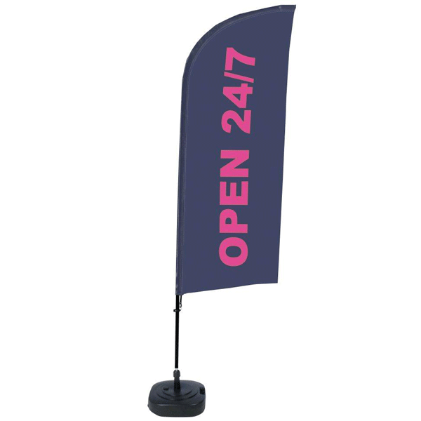 Et populært BeachFlag, der passer ind f.eks. på tankstationen og i kiosken. Leveres komplet med kraftig aluminiumsflagstang på Ø 28 mm i diameter inkl. vores standard printdesign “OPEN 24/7” i vindform og en vandtankbase. Et fantastisk flag klar til din udendørs reklame.