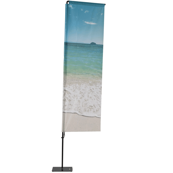 BeachFlag Outdoor Square 350 cm højt med rørdiameter på 28 mm og en rør godstykkelse på 1,5 mm. Den sort pulverlakerede flagstang giver flaget et luksuriøst udseende. På toppen af stangen er der en kraftig vinkelforbindelse, der giver flaget den rektangulære form. Samtidig sørger bøjlen for at flaget altid kan læses også når der ingen vind er. Den massive aluminiumsmast er nem at samle og har en praktisk spændingsmekanisme. Inden for få sekunder har du et flag, der skiller sig ud med sin form, størrelse og dynamik!