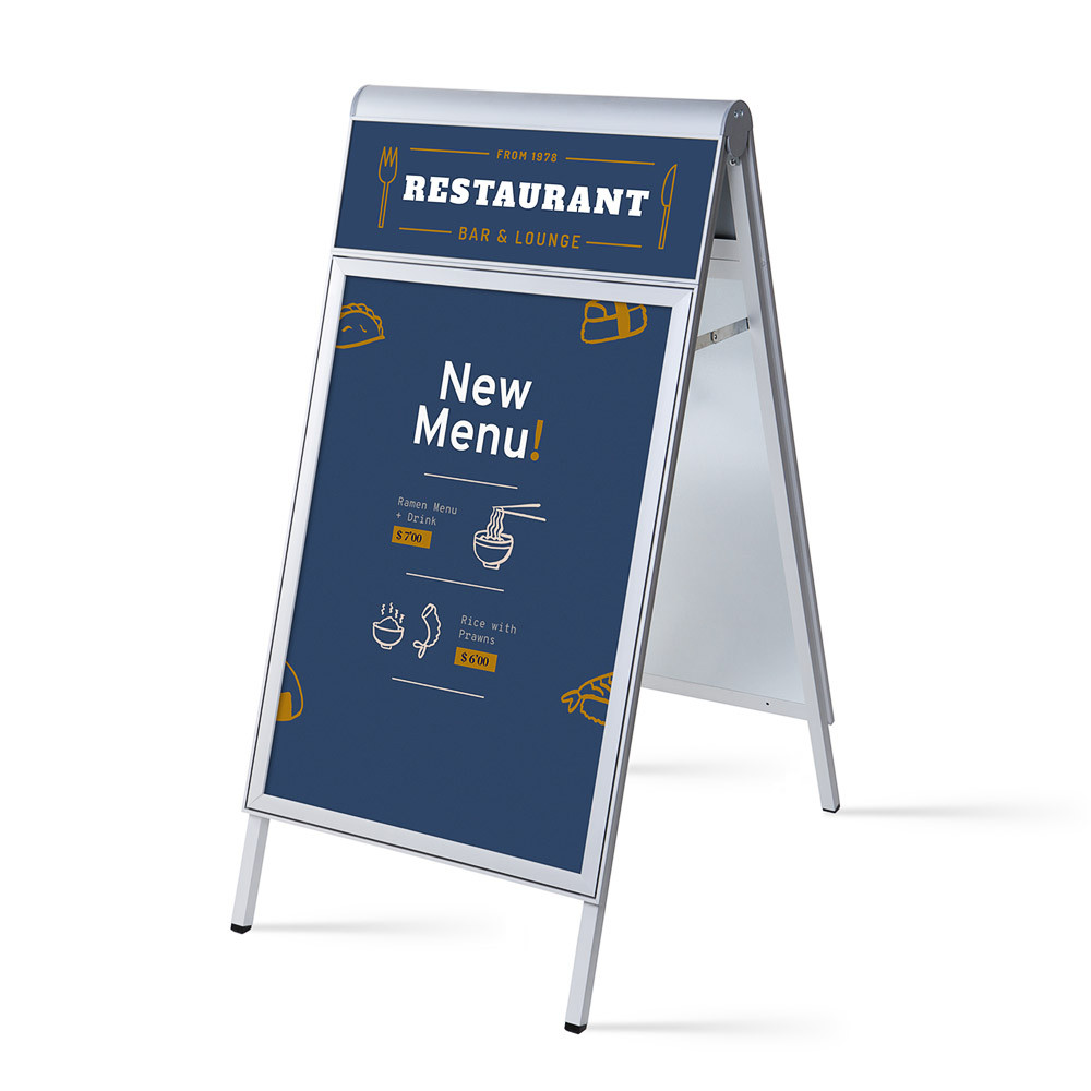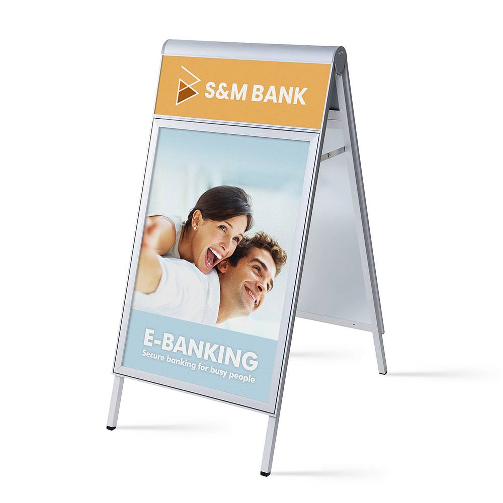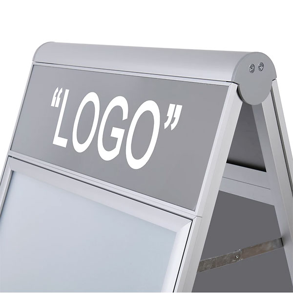 Gør dit brand umuligt at overse! Design Compasso® A-Board Logo kombinerer unik logoplads på toppen af et eksklusivt rammedesign der giver maksimal effekt. Skiltet er produceret i aluminium med galvaniseret metal bagpaneler og plakatlommer der holder dine plakater så godt som laminerede, og klar til daglig udendørs brug. Klik dine plakater ind og få optimal opmærksomheden.