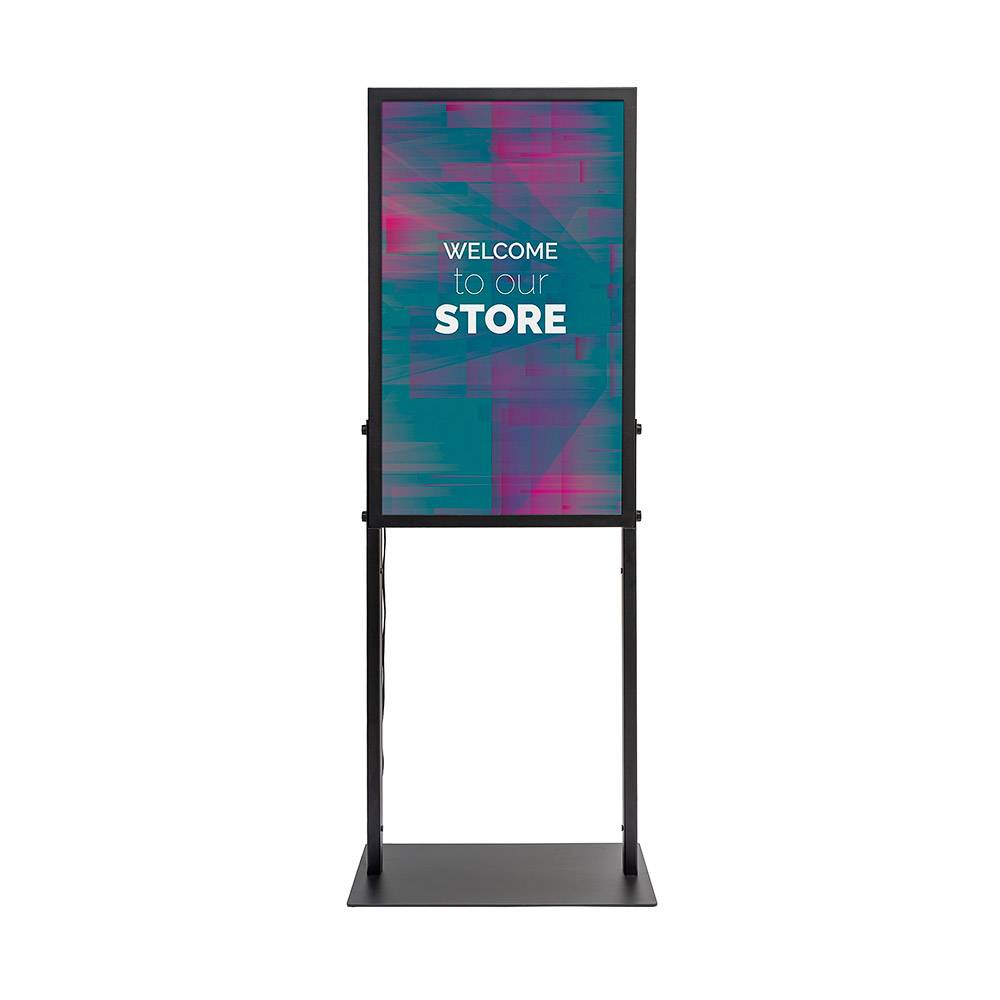 Hurtig montering og kompakt design. Præsenterer dit digitale indhold professionelt med denne fritstående skærm displayløsning. Skærmen er designet som bærbar enhed, brugervenlig og leveres i en pladsbesparende emballage, der passer perfekt ind i de fleste personbiler. Displayet samles på stedet med blot et par trin – monter støttestængerne på basen og fastgør skærmen. Det er et ideelt valg til reklamebrug på udstillinger, i butikker og ved live-arrangementer.