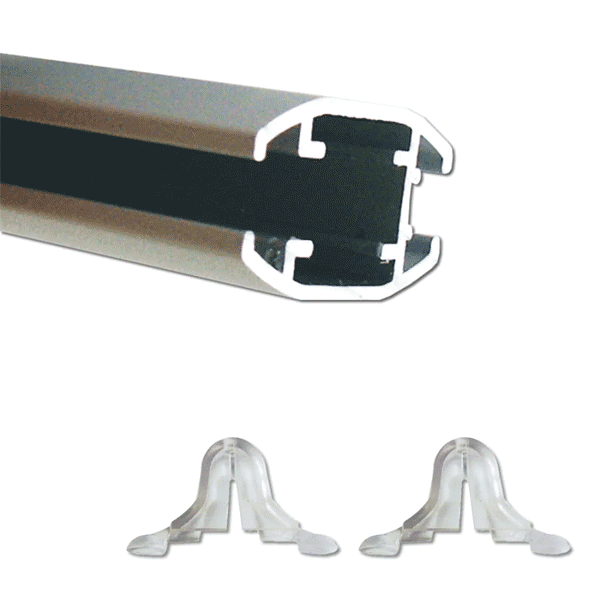Rammen har 2 transparente ophængsøjer i top-profilen og derfra og op til f.eks. loftet, anbefaler vi vores Wire ophæng 200 cm med 2 stålwire. Hver wire har løkke og kroge, som du kan placere på wiren i passende højde. Højdejusteringen er ligetil, idet du blot strammer den lille skrue på krogen, når du har fundet den ønskede højde.