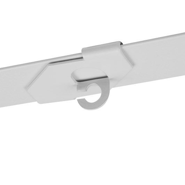 Drop loft kroge monteres på loftsprofil. Med STAS loftskroge kan du nemt hænge skiltning eller dekoration fra et sænket pladeloft med loftprofiler. Krogen skydes over det loftsets mellem profil. Leveres også med “lukket” øje på forespørgsel.