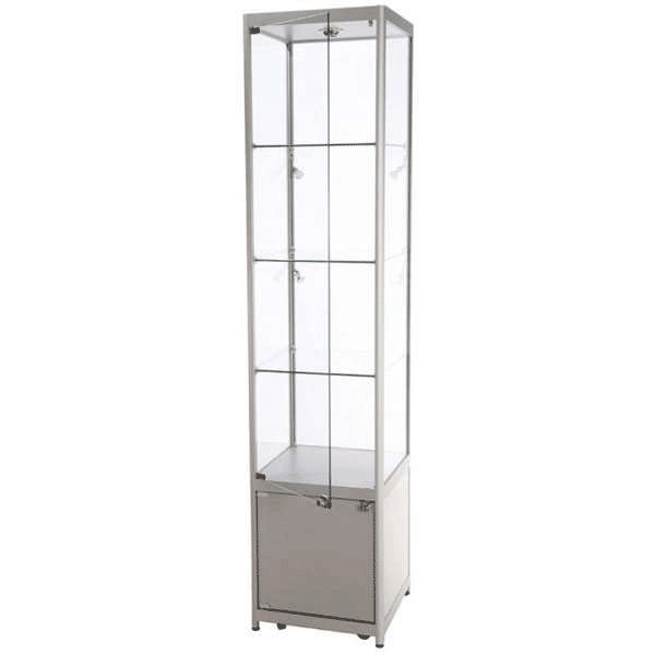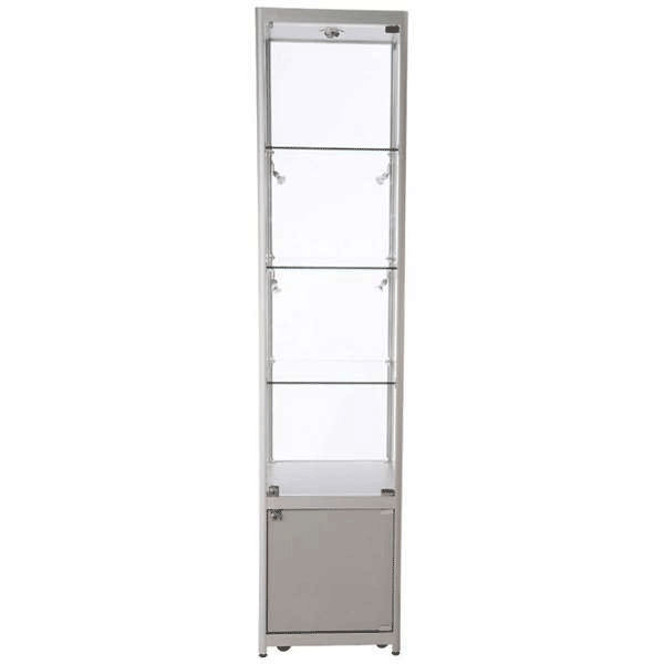 LED udstillingsmontre 45x200x45 cm med underskab. En elegant kombination af glasmontre med LED lys og aflåseligt lagerskab til skjult og praktisk opbevaring. Såvel glasskabets skydedøre som underskabets skabslåger er udstyret med cylinderlåse, der gør montren til den perfekte løsning, både når der udstilles og når der sælges fra det integrerede lagermodul uden at gå på kompromis med sikkerheden. Perfekt til opbevaring og udstilling af kostbare effekter. Glasmontrens udførsel i eloxeret aluminium og 7 mm hærdet glas udgør en robust konstruktion.