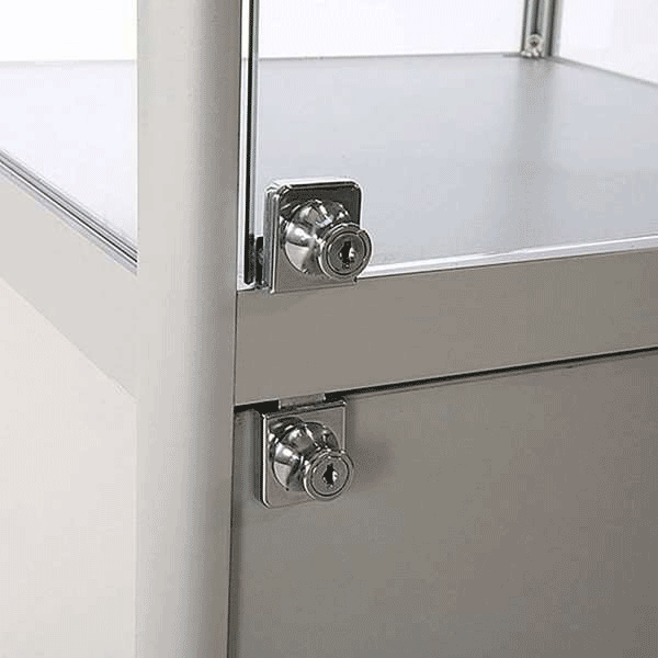 Med den aflåste glasdør og underskabets låge er dine ting godt beskyttet bag lås imod udefrakommende indblanding. Montrens mål er B 45 x H 200 x D 45 cm og vægten 69 kg. Den eloxerede aluminium finish giver et pænt og eksklusivt udtryk. Glasmontrens mange muligheder er en tryg og oplagt mulighed for udvidelse af salgsarealet i bl.a. butikker, museer og er en sikker investering, der øger omsætning af eksklusive varer.