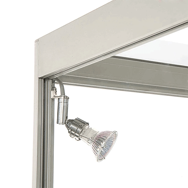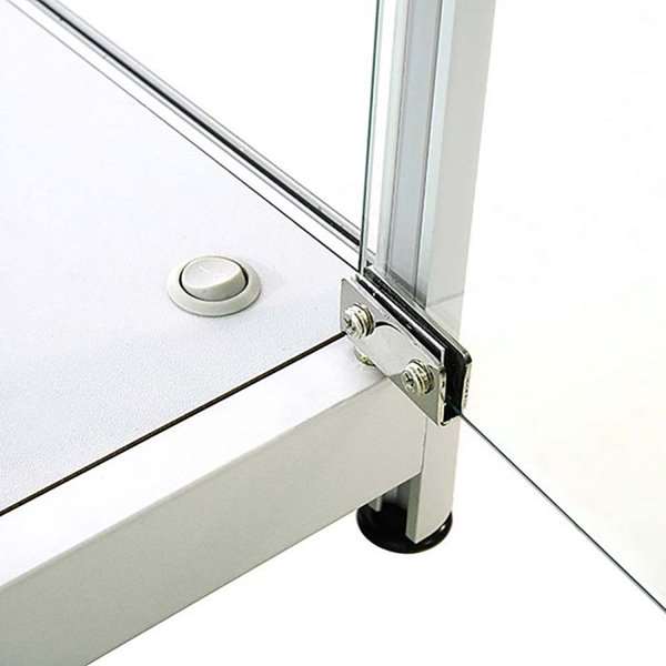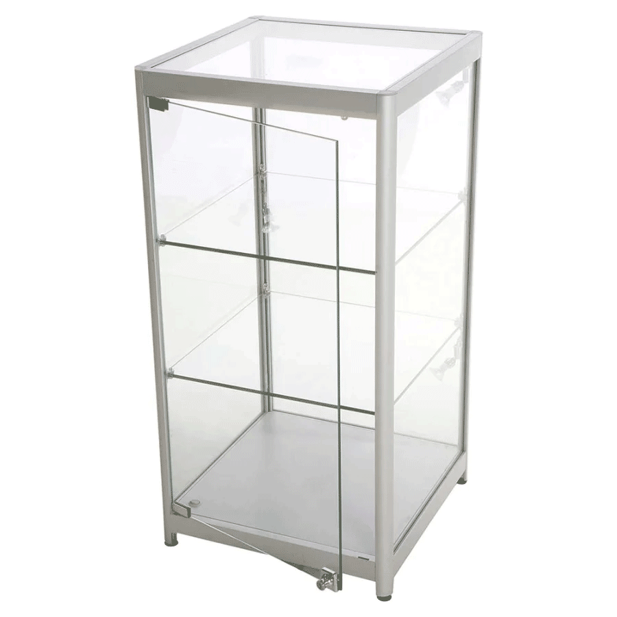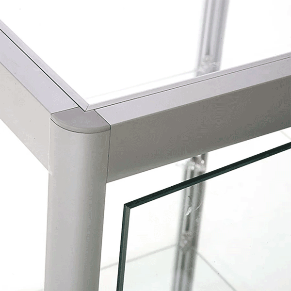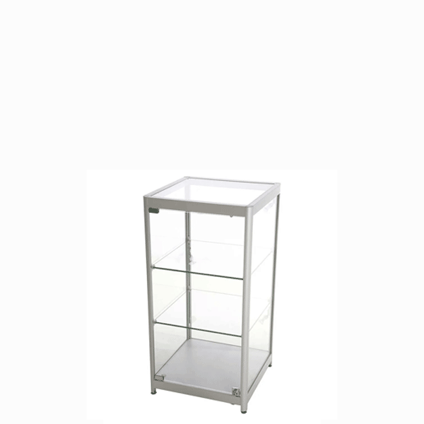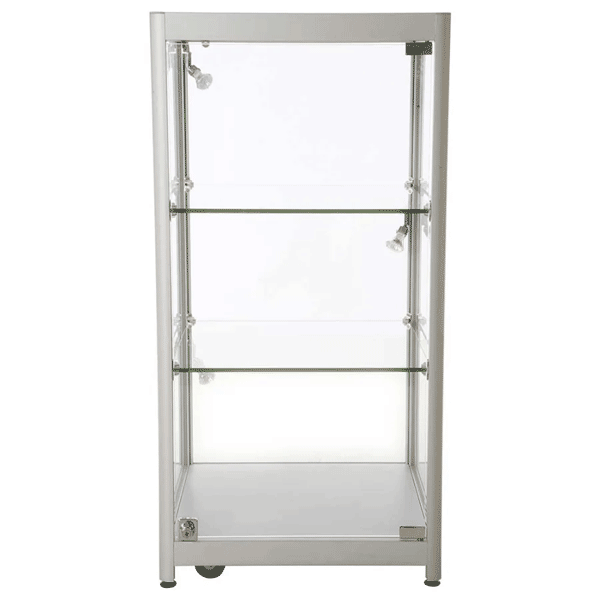 LED udstillingsmontren måler 45 x 90 x 45 cm og oplyses af de 3 medfølgende spots. Glasmontren, der leveres med en dør inkl. lås og to stk. nøgler, er en perfekt vitrine til præsentation af værdifulde objekter uden at du skal gå på kompromis med sikkerheden! Skabet har radius hjørneprofiler i sølvanodiseret aluminium og 2 justerbare glashylder, der kan bære op til 20 kg vægt. De 4 justerbare drejefødder sikrer god stabilitet. Dine genstande er altid beskyttet bag det hærdede glas og cylinderlåsene. Glasskabet leveres fragtfrit og samlet med sikker transport.