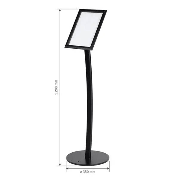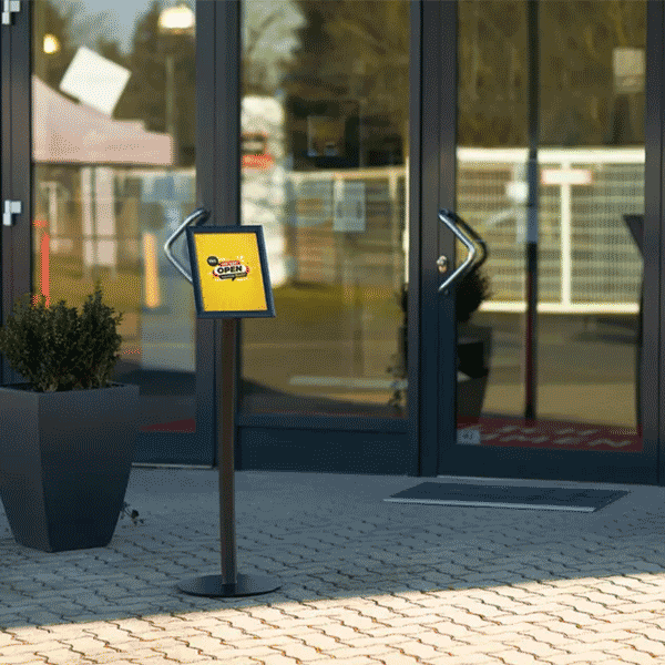 Menuboard Design outdoor er et elegant plakatstativ med plads til et print i A4 størrelse, enten på høj- eller bredformat. Et slankt design med en buet rørstang og en 25 mm snapramme til at holde din plakat. Du kan let og hurtigt skifte imellem hvilken orientering der passer bedst til dit budskab, stående eller liggende.