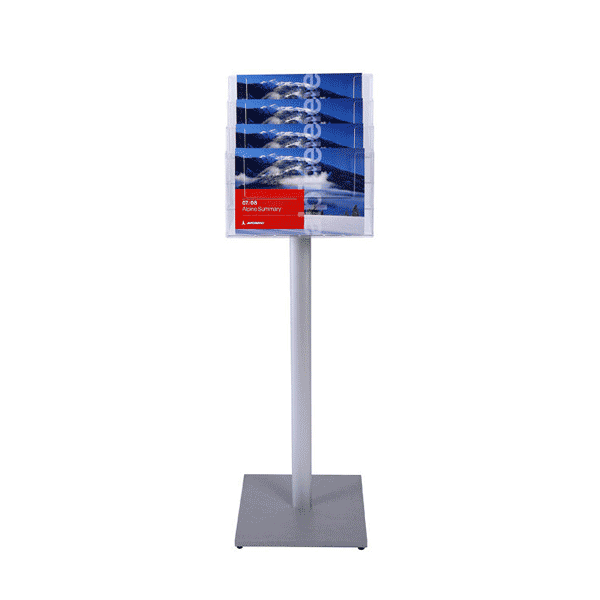 Brochureholderen Design Standard er en overkommelig og elegant måde at præsentere dine materialer på. De glasklare brochurefag er placeret på den sølvfarvede aluminiumsstolpe og rummer en god portion foldere og flyers uden at gå på kompromis med orden og stil. Den er let men robust og nem at flytte og opstille, hvor det er nødvendigt, hvilket gør den perfekt til receptioner, hotel foyer eller detailområder.