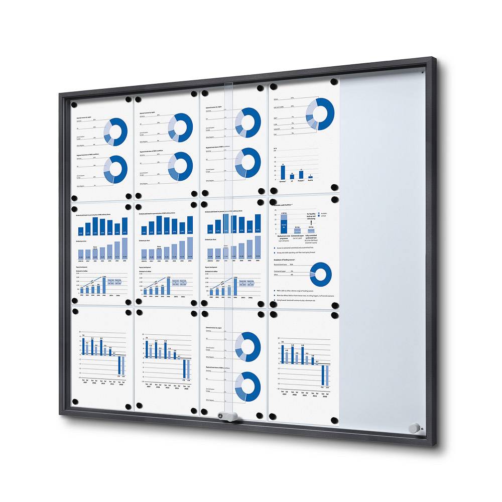 Opslagsskab slim med skydedøre 15xA4 Antracitgrå. Elegant slim indendørs udstillingsvindue med aflåselige skydedøre. Et tiltalende design, der har alle de nemme og holdbare funktioner fra en montre med lås og nøgler. Et slankt, rent profildesign med en glidende sikkerhedsglasdør og skrivebar og magnetisk bagvæg. Slankt og elegant design med en indendørs lås-bar vitrine med skydedøre Slim!