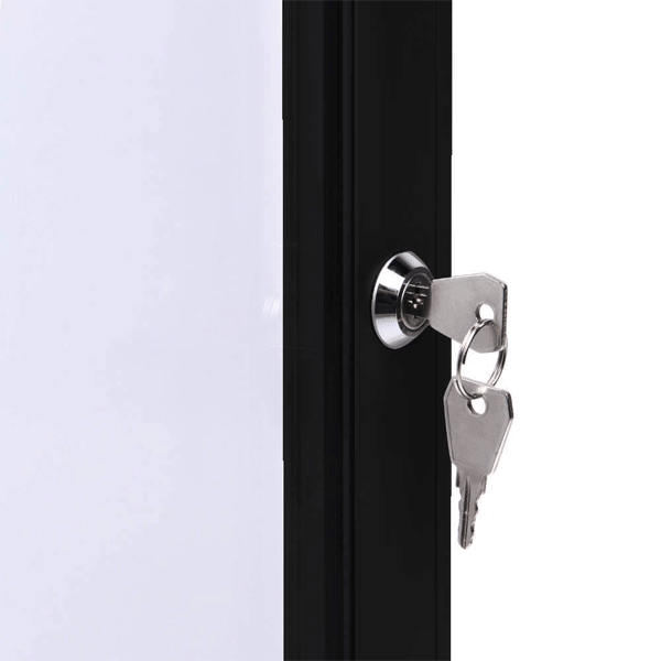 Eksklusivt SORT Opslagsskab 4 xA4 med magnet- skriveplade til whiteboardpenne. Anvendes til opslag med magneter og som whiteboard. SCSC9005 4xA4 Indendørs – Udendørs opslagsskabene kan anvendes udendørs, såfremt de er overdækket, så det ikke regner direkte på udhængsskabet. Vinduet er i slagfast akrylglas.