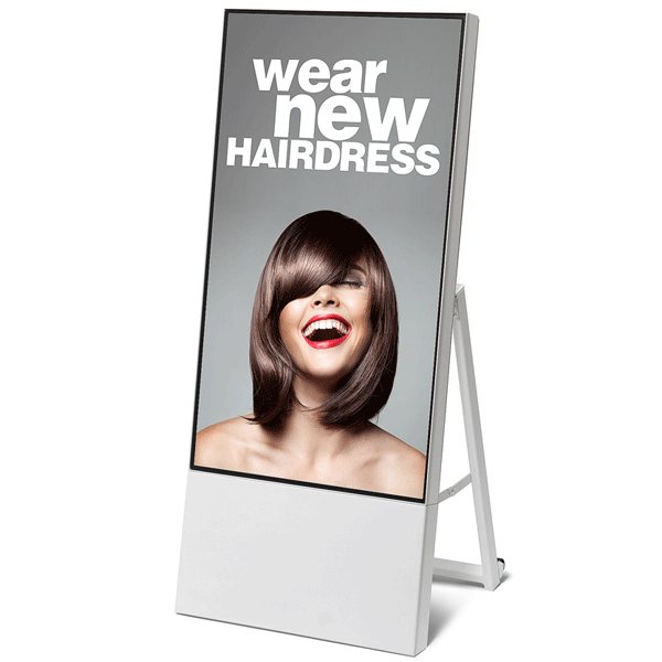 Smart Line A-Board hvid med 43″ Samsung skærm er udført i holdbart og smart slim design uden ramme. Ideel til showrooms, receptionen, butikker og alle andre indendørs events. Det skiftende billede vil tiltrække langt mere opmærksomhed fra gæster og kunder, og er en oplagt mulighed for at du kan være super aktuel med dine budskaber 24/7. Det digitale skilt er enkelt at folde ud og ind, hvilket i plano tilstand gør det nemt at transportere.