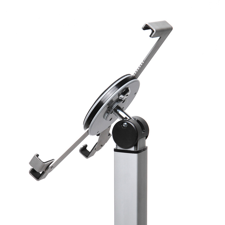 Tabletholder Trigrip gulv 13″ – sølv med et unikt låsesystem, er eksklusivt designet og skærmen kan vinkles i alle retninger og roteres 360 grader, så skærmen kan anvendes både på høj-og bredformat.