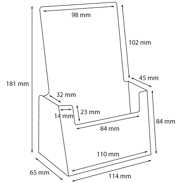 TAYMAR brochureholder bordmodel med ét rum til M65 stående format. Holderen kan også anvendes til format A6. Bemærk at rygstøtten er 181 mm høj.